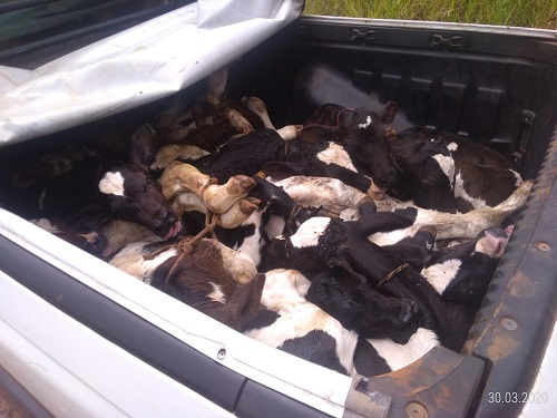 Na vistoria ao veículo foi verificado o acondicionamento de 11 bezerros na sua carroceria, sendo que estes estavam amarrados e a lona estava fechada. Tal situação configurou crime de mais tratos. Animais foram apreendidos.