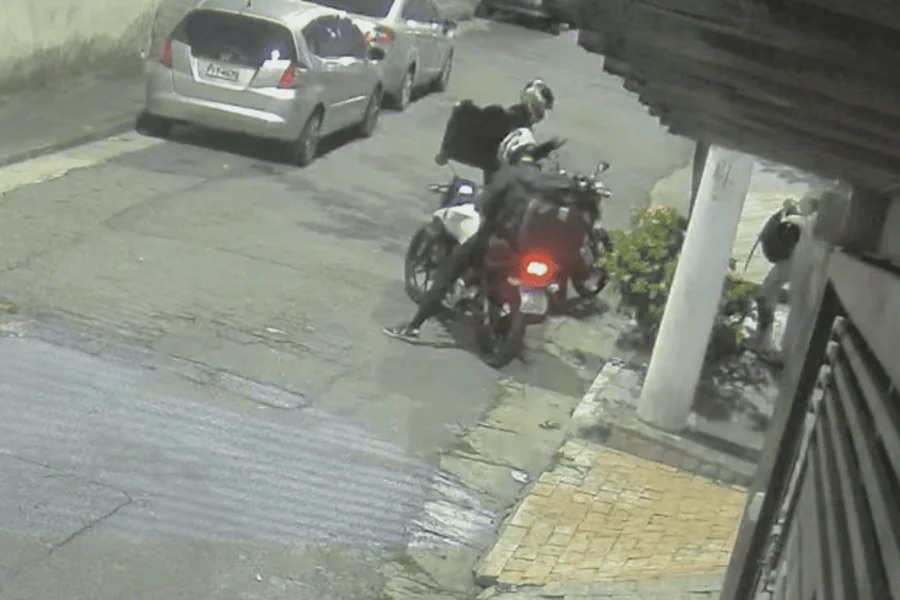 O vídeo flagra duas motos circulando pela Rua Maria Medeiros por volta das 21h14. Ao verem a mulher, os suspeitos retornam e a abordam. A vítima levanta as mãos, entrega o que pedem, mas ao abrir a mochila puxa a arma e atira. Um dos criminosos cai quase imediatamente. O segundo ainda levanta as mãos em rendição antes de ser atingido.