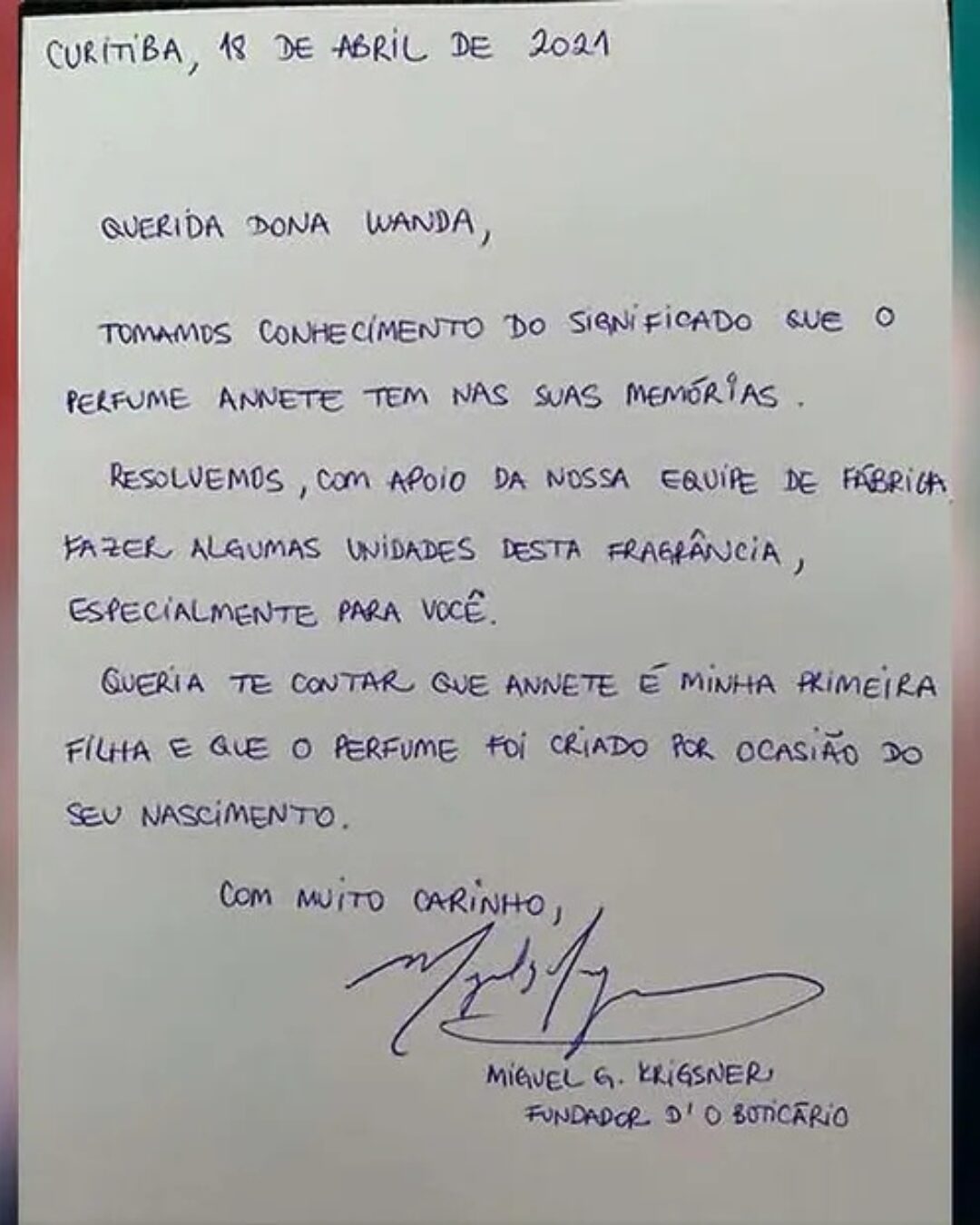 Sensibilizada com a história, a marca decidiu fazer um gesto inesquecível: reproduziu o perfume especialmente para a mãe, trazendo de volta não apenas a fragrância, mas também uma parte do amor que ficou. A ação foi acompanhada de uma carta escrita à mão por Miguel Krigsner, fundador do Boticário, agradecendo à dona Wanda por permitir que a marca participasse de um momento tão íntimo e significativo.