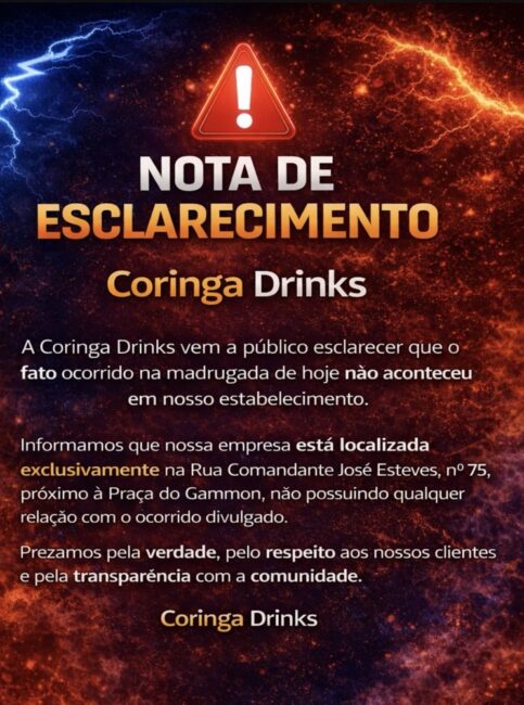 Na nota, a Coringa Drinks afirma que sua unidade está localizada exclusivamente na Rua Comendador José Esteves, nº 75, nas proximidades da Praça Dr Jorge, e que o caso registrado ocorreu em outro local da cidade.