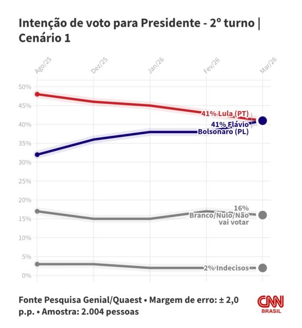 A nova rodada da pesquisa Genial/Quaest divulgada nesta quarta-feira 11 de março aponta uma mudança significativa no cenário eleitoral para 2026. Pela primeira vez o senador Flávio Bolsonaro PL aparece numericamente empatado com o presidente Luiz Inácio Lula da Silva PT em uma eventual simulação de segundo turno. Ambos os pré-candidatos registram 41% das intenções de voto no principal cenário testado pelo instituto de pesquisa.