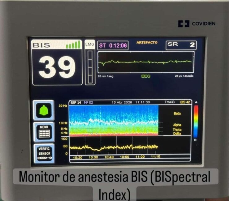 A segurança anestésica também é prioridade, com o uso do sistema BISpectral (BIS). O monitoramento da atividade cerebral em tempo real assegura que o paciente permaneça no plano hipnótico ideal, evitando tanto a consciência intraoperatória quanto a sedação excessivamente profunda. “O BIS é um auxílio fundamental para a segurança do paciente”, explica o anestesista Dr. Ricardo Gama de Oliveira.