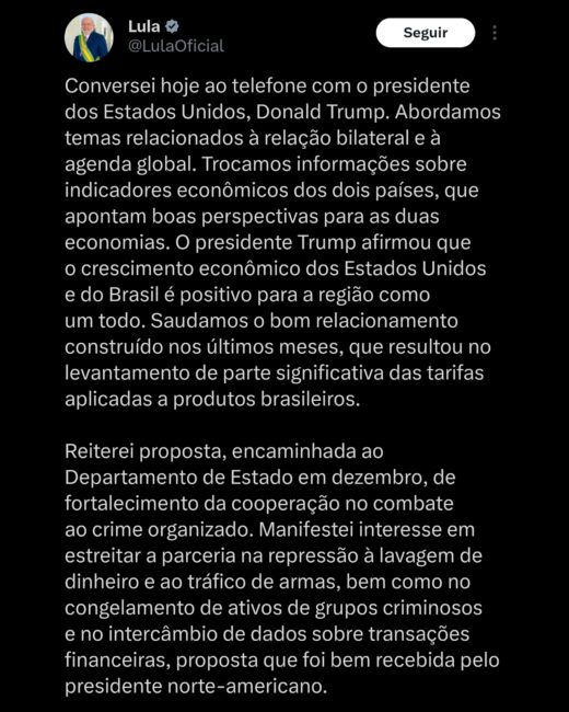 O presidente Luiz Inácio Lula da Silva afirmou que conversou por telefone com o presidente dos Estados Unidos, Donald Trump, nesta segunda-feira.
