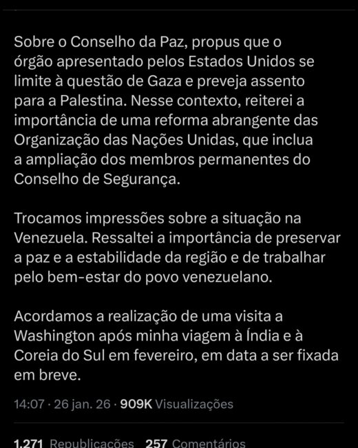 Ao final da conversa, Lula e Trump combinaram uma visita do presidente brasileiro a Washington após viagens oficiais à Índia e à Coreia do Sul, previstas para fevereiro. A data ainda será definida.