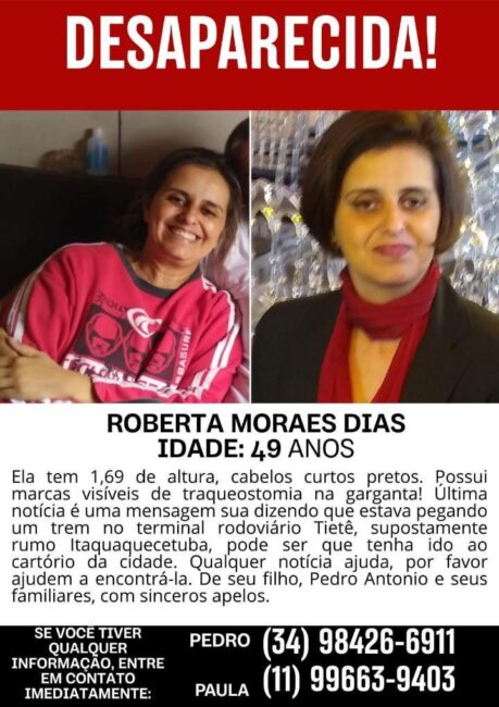 Com 1,69m de altura e cabelos pretos curtos, Roberta possui uma marca física característica de uma traqueostomia na garganta. Ela tem uma deficiência cognitiva que a torna vulnerável em situações de desorientação. O último contato ocorreu na quarta-feira, dia 18, às 16h40, quando enviou uma mensagem dizendo que havia passado mal, mas que já se sentia melhor. Após isso, seu celular não recebeu mais chamadas e ela interrompeu a comunicação constante que mantinha com o filho, Pedro.