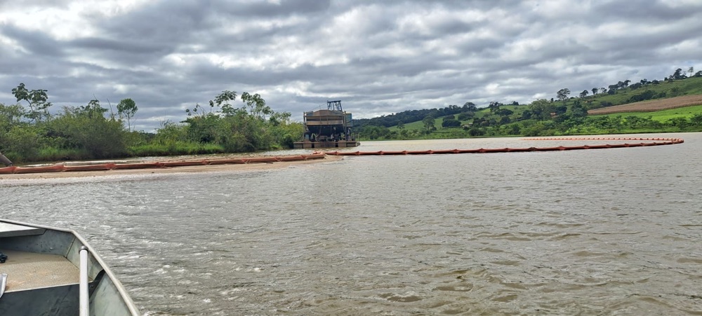 Durante fiscalização no dia 14 de abril, a equipe do 1º Grupamento PM de Meio Ambiente constatou intervenção irregular no recurso hídrico, com lançamento de sedimentos que provocaram assoreamento, formação de bancos de areia (“arrotos”) e supressão de vegetação nativa. Os rejeitos comprometiam a fluidez da água, a segurança da navegação fluvial e a fauna aquática.
