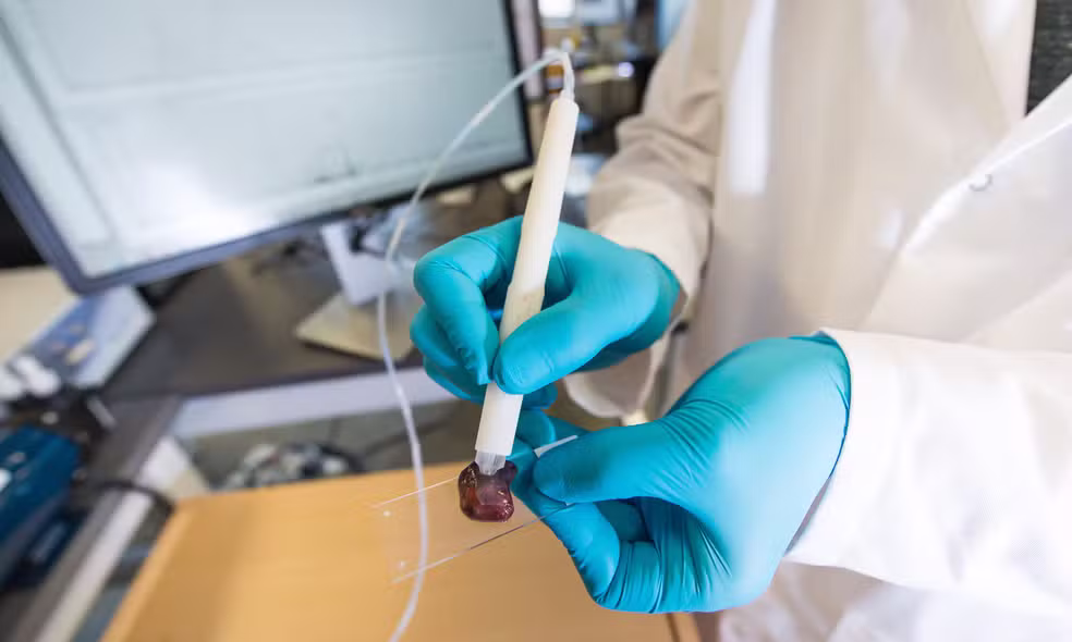 Durante o procedimento, o médico encosta a ponta da caneta sobre o tecido suspeito. O dispositivo libera uma microgota de água estéril, que permanece em contato com o tecido por alguns segundos. Essa gota extrai moléculas da superfície e é aspirada para o espectrômetro, que analisa sua composição química. O sistema identifica o padrão molecular — algo como uma impressão digital biológica — e mostra na tela se o tecido é saudável ou cancerígeno, num processo que leva de 10 a 90 segundos.