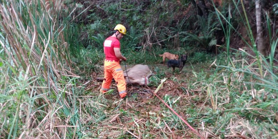 Uma vaca foi resgatada pelo Corpo de Bombeiros nesta segunda-feira (1º), após ficar atolada em um córrego em Oliveira, no Centro-Oeste de Minas Gerais.